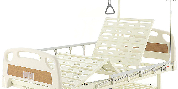 Кровать - 4-х секционная с винтовым (механическим) приводом регулировки угла наклона спинной и ножной секций. Основание кровати выполнено из стали, покрыто ударопрочной эпоксидной эмалью. Съемные спинки головы и ног с противоударными бамперами выполнены из ABS-пластика. Выдвижной регулятор положения ложа расположен в ножной части кровати, что позволяет персоналу легко регулировать положение ложа. Боковые ограждения (2шт) выполнены из алюминия и легко опускаются, обеспечивая быстрый доступ к пациенту. Несущие колеса кровати изготовлены из высокопрочной стали и закрыты декоративными колпаками, придающими кровати современный внешний вид.